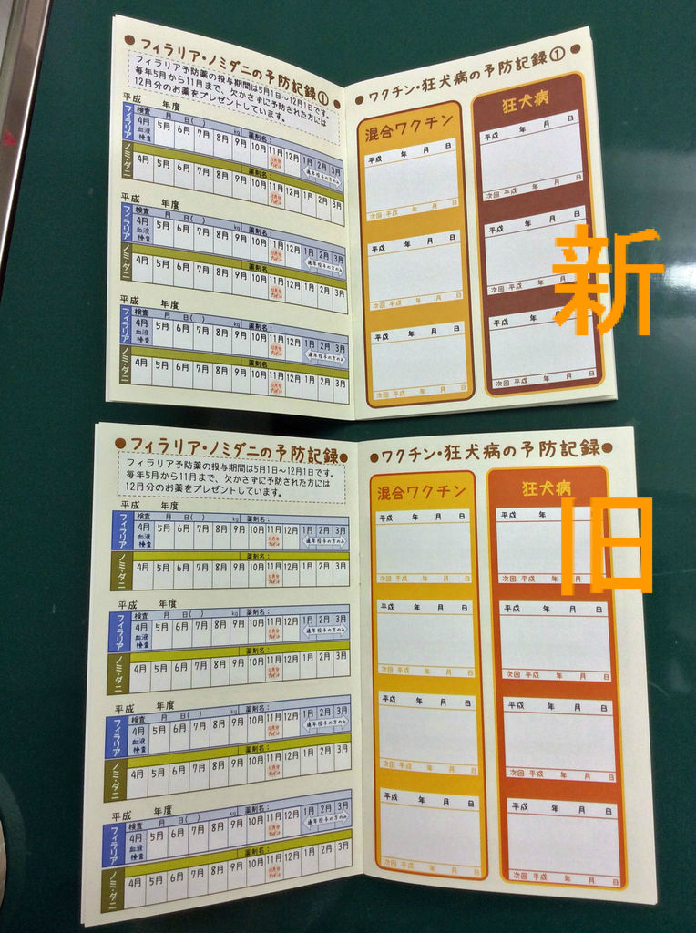 少し前に、フィラリア検査をしたワンちゃんにお渡ししている健康手帳のデザインを変更しました。