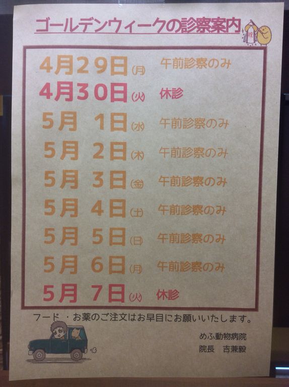 ゴールデンウィークの診療のご案内です。