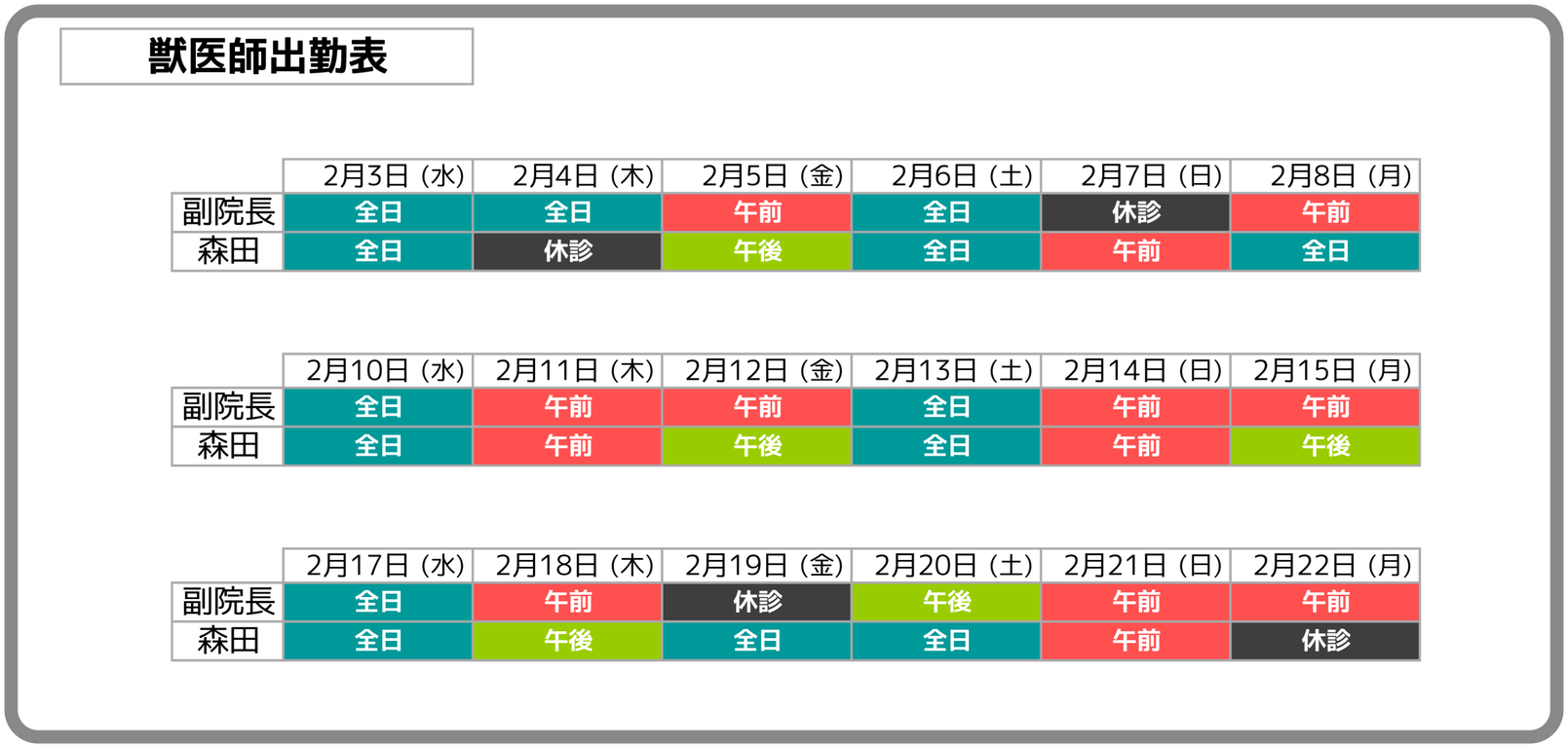 なお、上期間中は「獣医師指名でのご予約」を頂いた患者様以外は獣医師の指名は出来かねます。また、指名でのご予約を頂いていた場合でも点滴や処置等は他の獣医師や看護師が行う事があります。予めご了承ください。