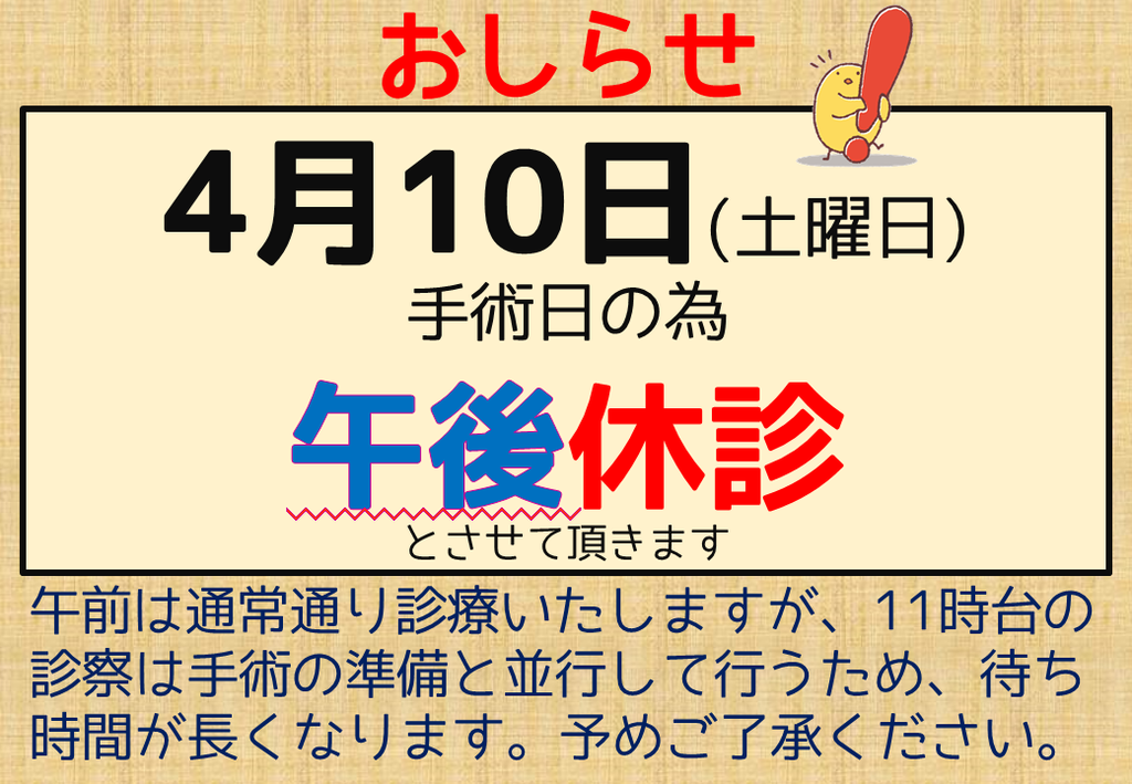 なお、副院長の出勤につきましては子供の小学校のアレコレで急に変更される事もあるかもしれません。あらかじめご了承ください。