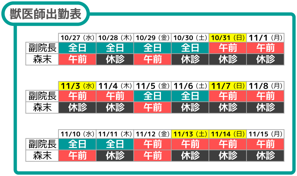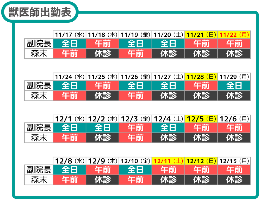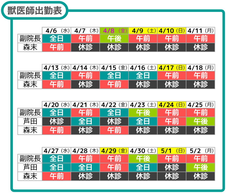 5月上旬頃までの獣医師の勤務表を掲載いたします。