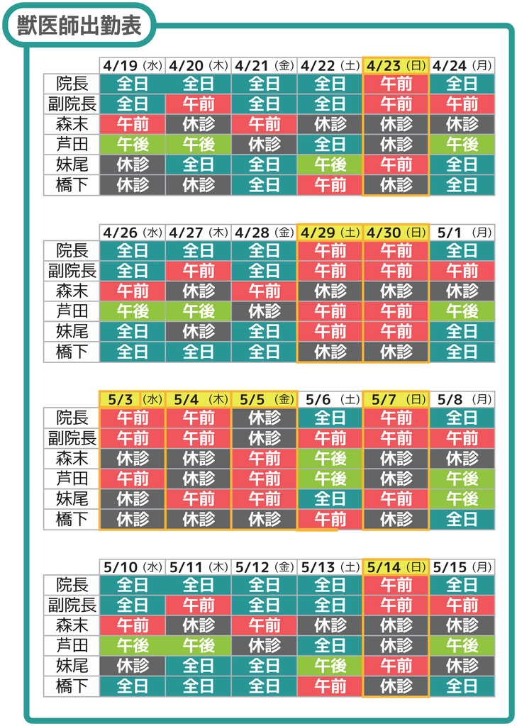 獣医師出勤表を再掲いたしますので、獣医師のご希望がある方はご参照ください。