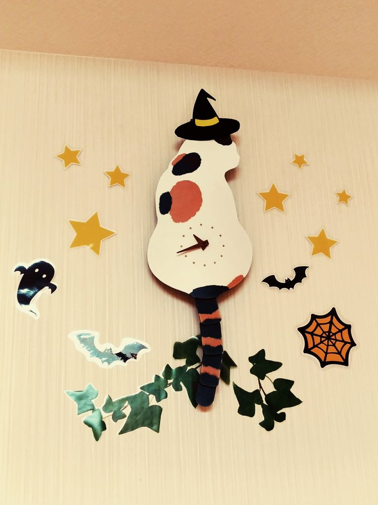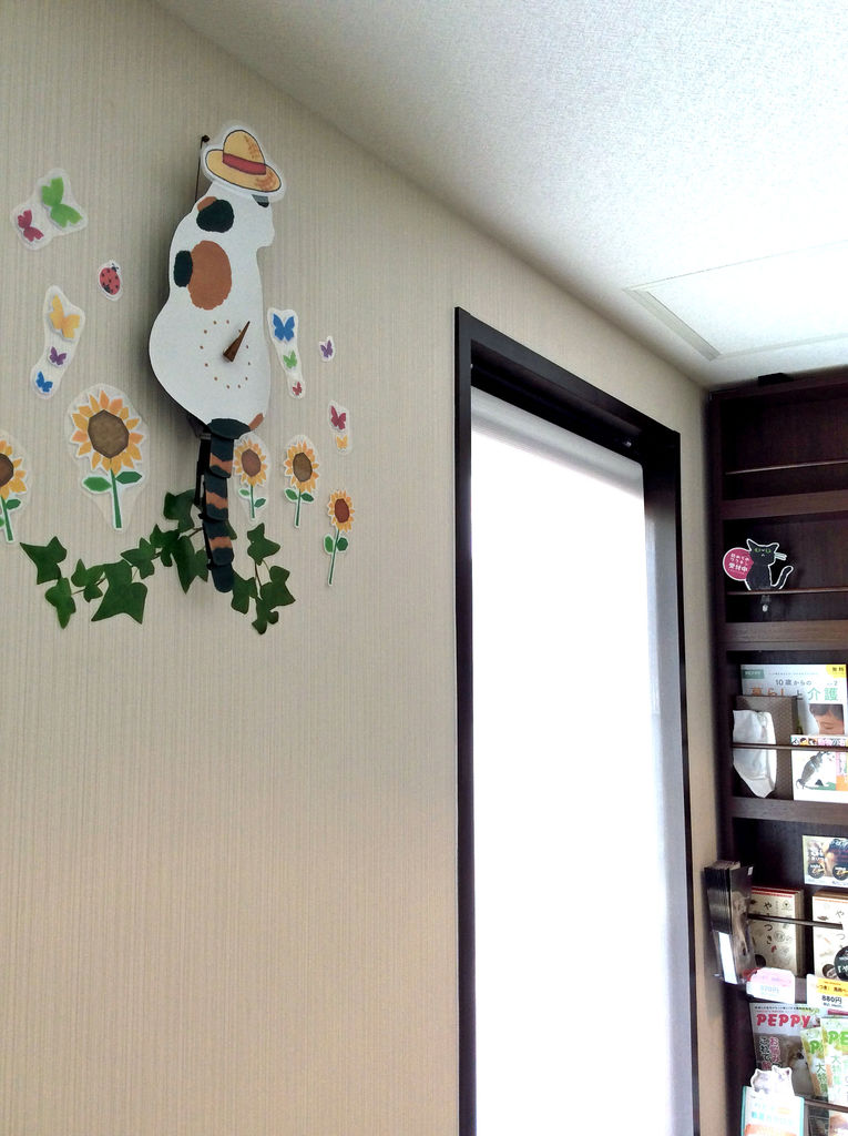 この待合室の壁にかかっている猫時計、地味にちょいちょいコスプレしております。