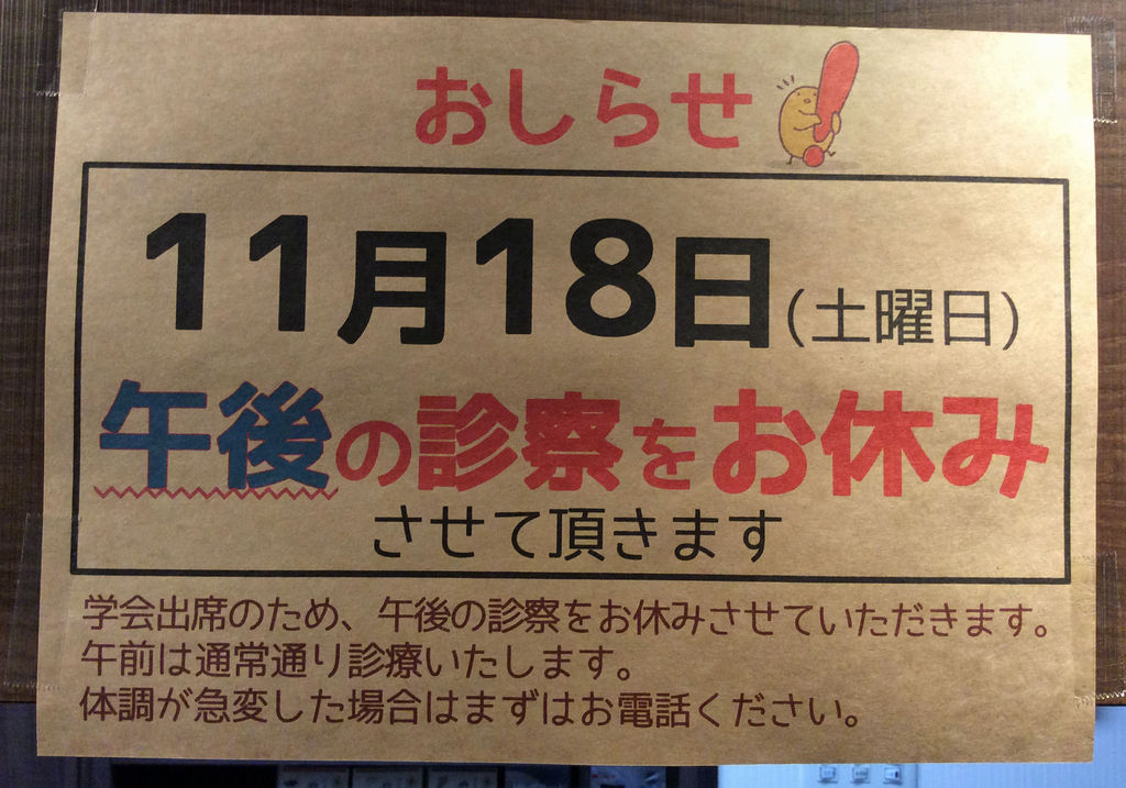 午後の診察はお休みですので、ご注意下さい。